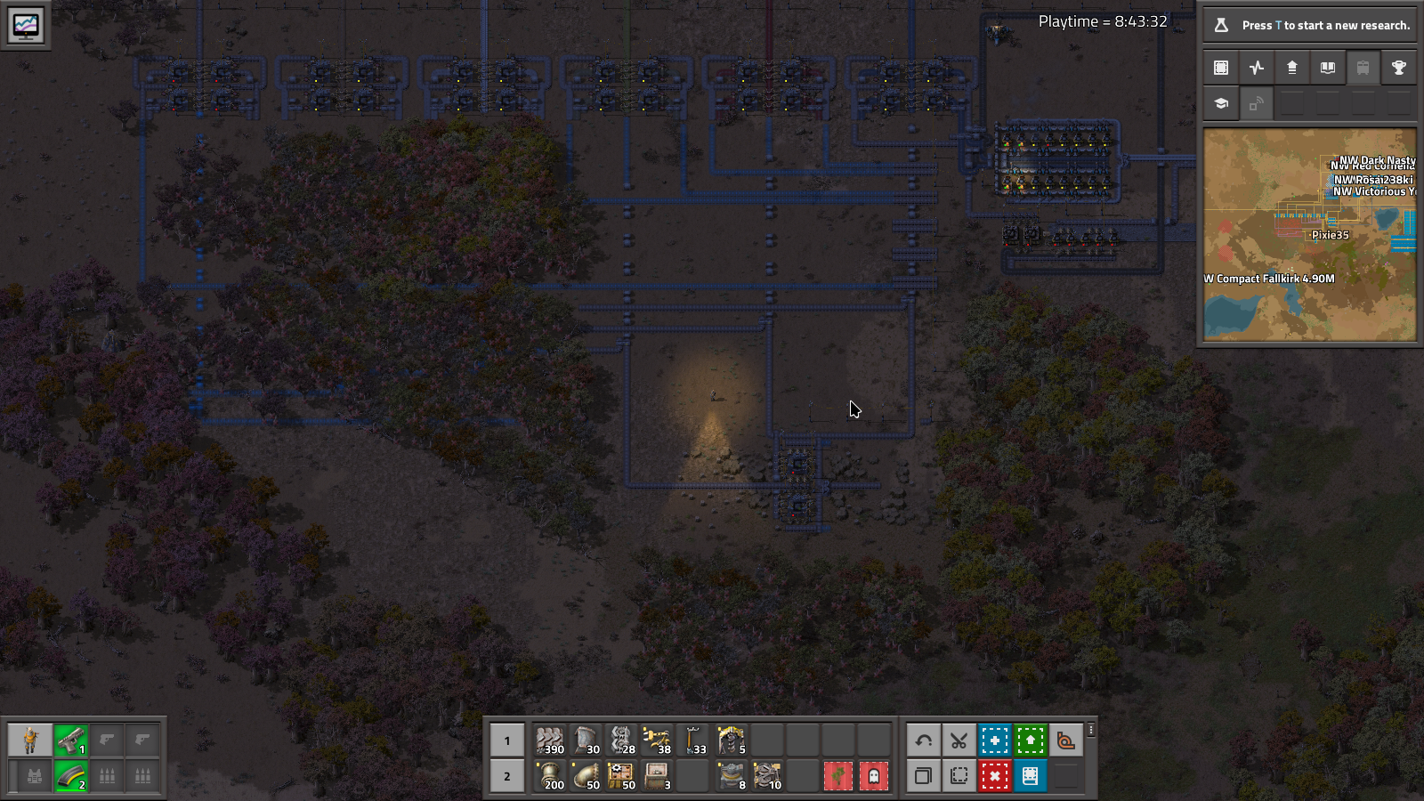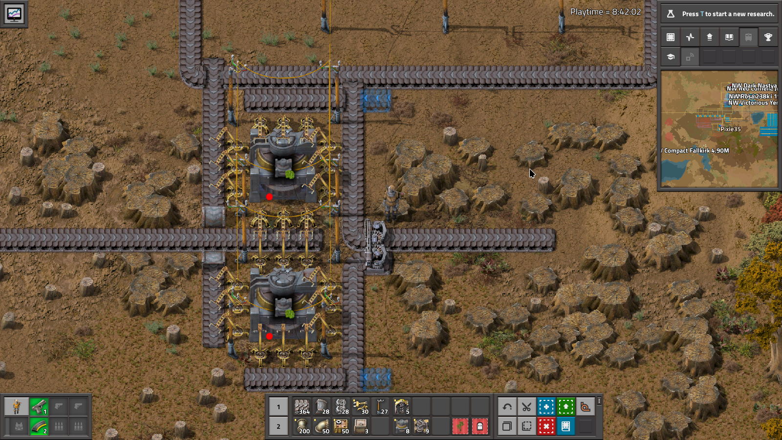 And this is where I caved, and installed blueprint shotgun. After researching it, I found that the shotgun itself requires Electronic circuits, to my extreme disappointment. So I carried on, chopping trees, making belts lanes, setting up all the bits and here is the complete ferrous and cupric sorting along with an overview of the whole crushing setup.