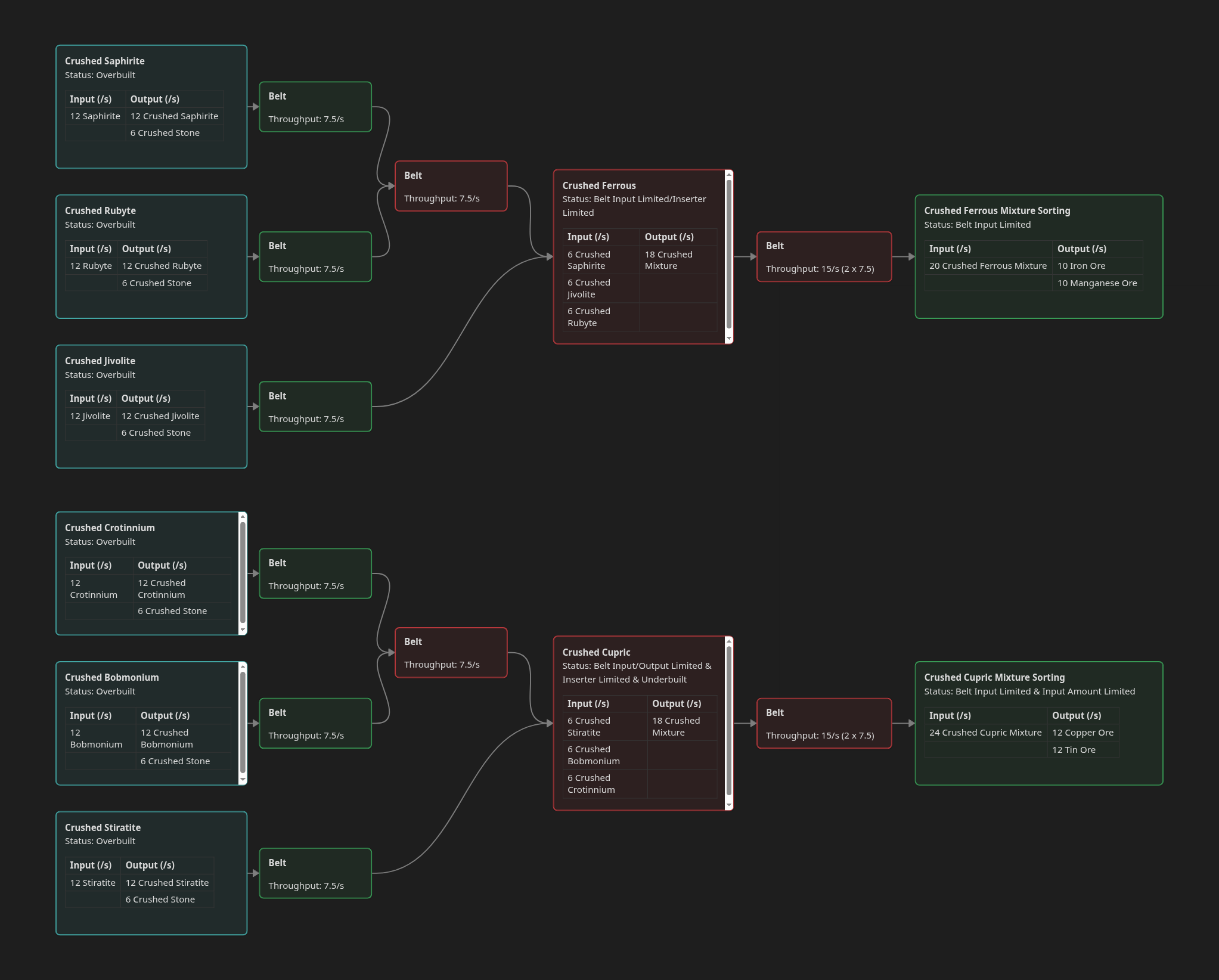 've not taken into account the input belts or limits of the crushed ferrous outputs. Crud. For 9.5 iron ore/s, I need 19 crushed ferrous/s, which is two and half basic transport belts, or 1.2 transport belts. To produce the 19 crushed ferrous/s I need three crushers running, not the current two, due to the output constraints of the inserters. This is difficult, because I really like how compact the two crusher setup is and I can improve the output rates when I unlock fast inserters, so I'll keep it for now. Same with the ore sorting, trying to setup three belts through the middle will be a huge pain, compared to just two transport belts and upgrade when I unlock them.