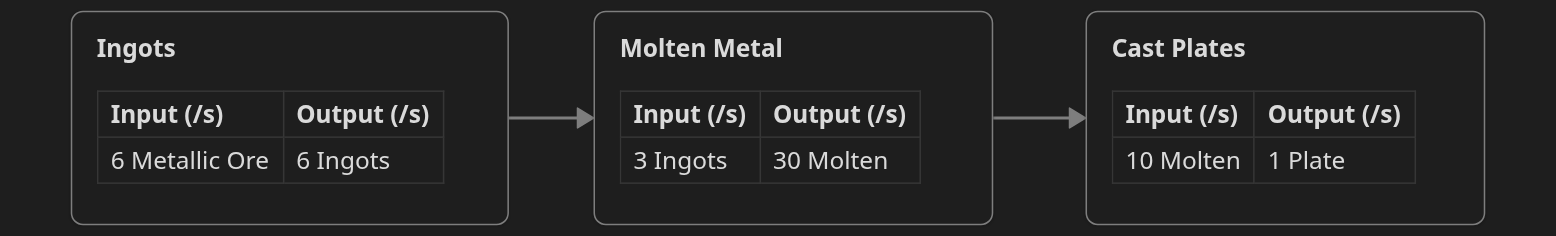 | Iron Plate (/s) | Copper Plate (/s) | Tin Plate (/s) | Solder (/s) | Lead Plate (/s) | Wood (/s) | |