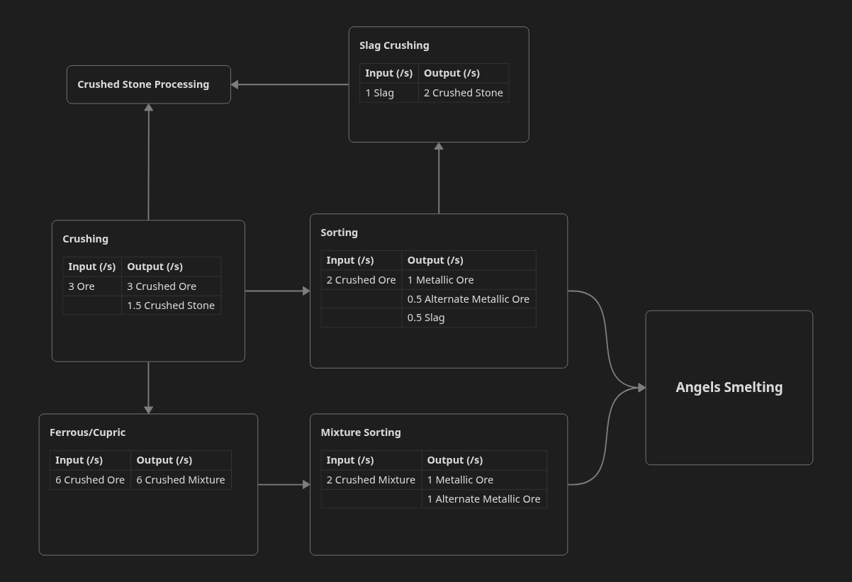 With the plans to go straight to manganese and molter iron II smelting, I reduce my iron ore input to just 9.75/s. This will mean I need to produce 6.5/s crushed Saphirite, Jivolite, Rubyte. The copper to tin ratio is not quite close enough, so I will initially reduce the outputs to 11.8 copper ore/s until either pure ore is unlocked or I desperately need more copper. Using cupric ore sorting, I will need 7.8/s crushed Stiratite, Bobmonium and Crotinnium. Lead will initially be done from mixed ore sorting, with the by product of nickel. Whilst I'll plan for a 3.5 lead/s output, I'll only start with 1/s lead for solder and just warehouse the nickel for now.
