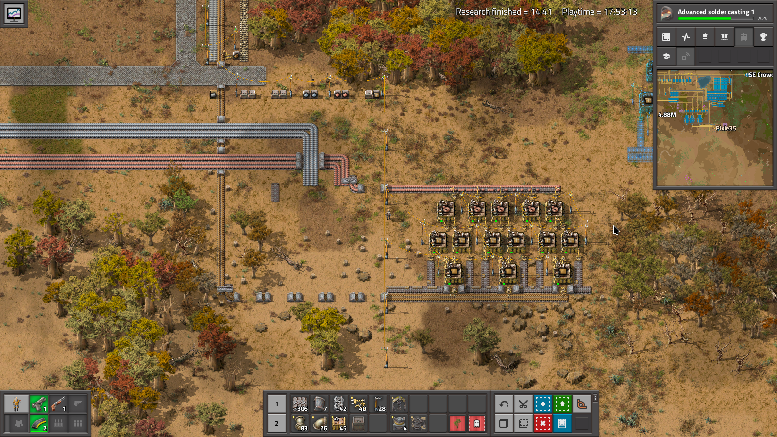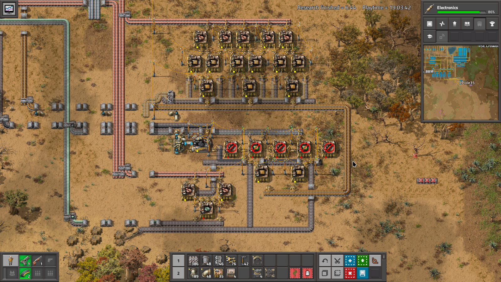 Yeah, it seems minor, but having this written down, means I can allocate space to the whole set up, and just like that, I have the Basic Circuits built, at 3/s. And as I start thinking about putting in the space for Electronic Circuits, I remember that solder needs to be on the belt. Ugh. Out with the Tin/Lead, in with the Tin/Solder combo.