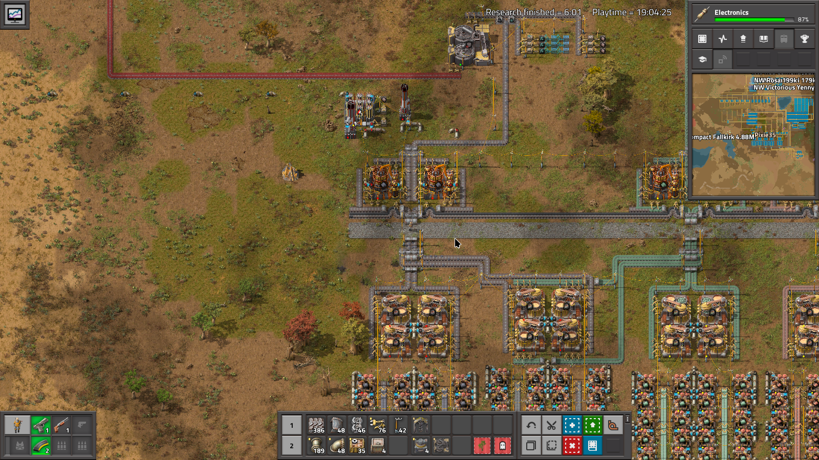 After getting solder and lead sorted, I head back to the belt to start electronic circuits. It's not pretty, its not fast at 1/s but it's enough to get by right now. I'd forgotten that carbon is needed for electronics, so coke is on the bus after taking a little tap off my smelting set up. Just waiting for the research to finish and then I'll mark this project as done.