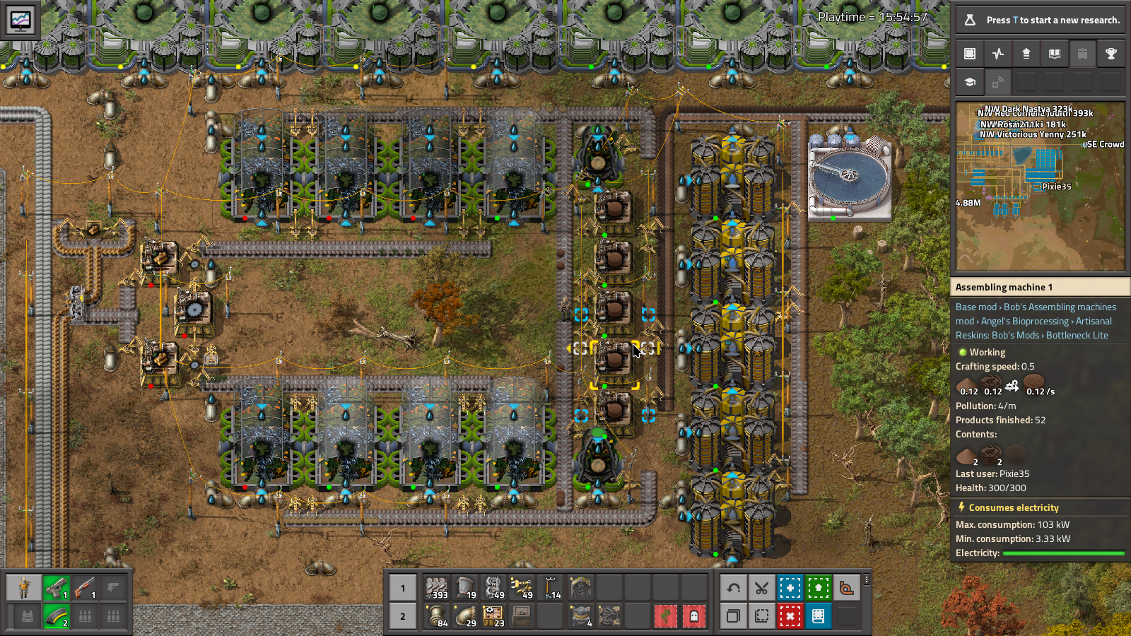 The whole tree farm process is pretty easy, take water, tree seeds and soil and you get trees to cut up into wood. Tree seeds are cultivated in special little tree seed farms, which take the Angel's Bioprocessing trees that you find all over the map. All the soil is made from mud and compost, which is currently a by-product of the power plant. Mud is just refined muddy water, from a special deep pump that pulls it out the water.