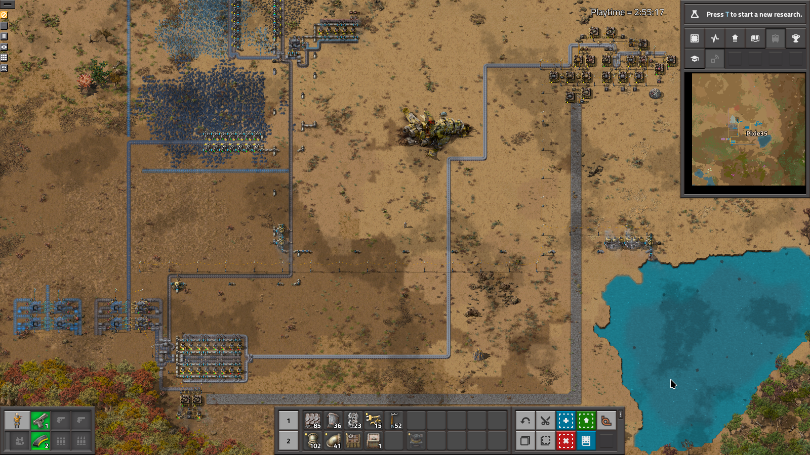 A reason I picked this map was due to the location of all the starter ores all being clustered in top right. This naturally broke the map into easy quarters where I could do all the independent steps until I needed to start bring trains into the base with more ore. The top left quarter suits that train depot need very well. Bottom left can be used for the large refining chains and stone processing that comes with Angel's refining and Smelting, before the bottom right corner being for circuit construction, a small main bus and the resulting labs. I'll tuck power up next to the lake for the moment.